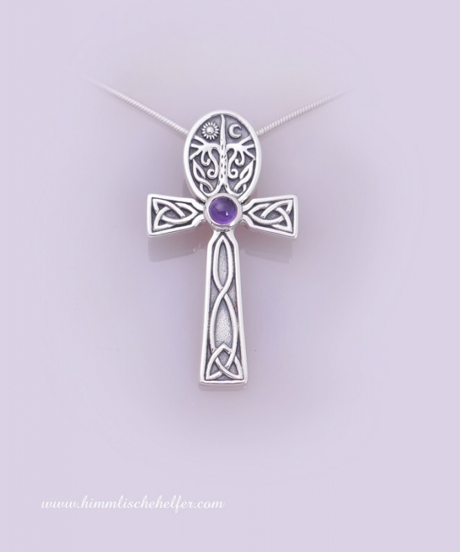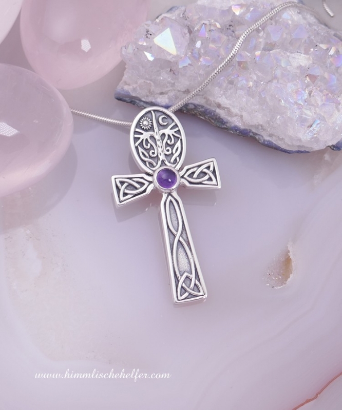 Ein wunderschöner großer Ankh Anhänger aus 925er Sterling Silber mit einem gefassten Amethyst als Kettenanhänger mit einer ganz besonderen Bedeutung. Mehrere spirituelle Symbole vereinen sich in diesem Lebenskreuz, dass eine kraftvolle Energie in sich trägt. Ein Schutzamulett mit der Kraft des Lebens, das Negatives fern hält. Elemente des keltischen Lebenskreuzes, Symbole aus der Natur, wie die Kraft des Mondes und die Energie der Sonne, verbunden mit traditionellen keltischen Schutzknoten. Das Ankh ist das ägyptische Lebenskreuz - es steht für Leben, Gesundheit und Unsterblichkeit. Der Amethyst gilt als Stein der Träume, Freundschaft und Spiritualität, er verbindet uns mit der Kraft der Natur und der Bedeutung der Edelsteine. Kunstvoller Silberschmuck in filigraner Ausarbeitung, edles Schmuckdesign nach Künstlervorlage, handpoliert. Material: 925er Sterling Silber, Amethyst in Silber gefasst (nicht geklebt). Lieferung ohne Kette (fotografiert mit einer Schlangenkette 1,2mm) ohne Dekoration. Größe Ankh Anhänger ca. 4cm x 2,2cm.