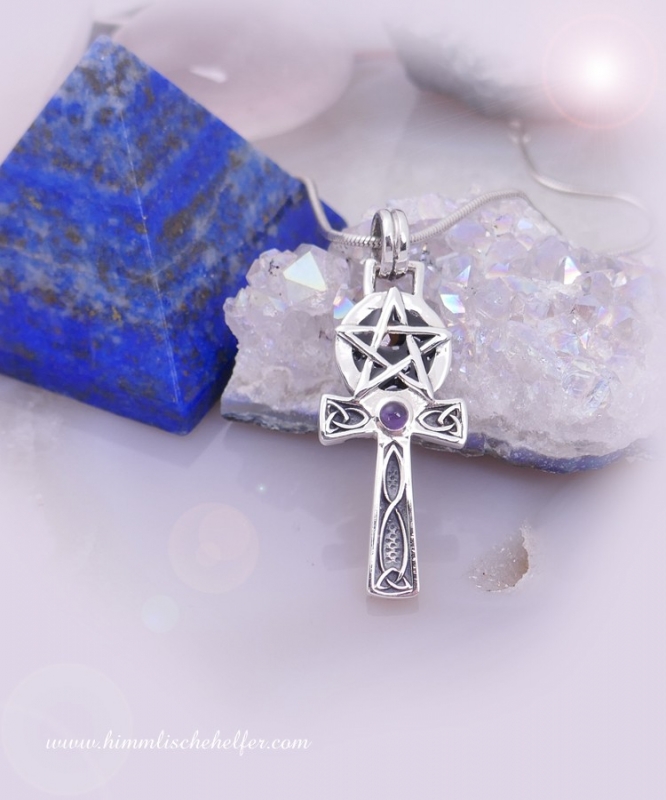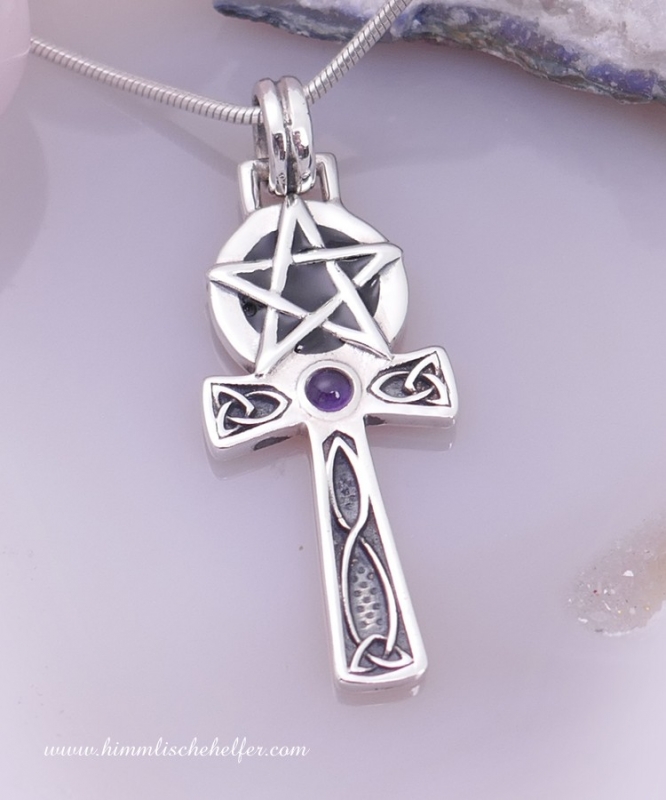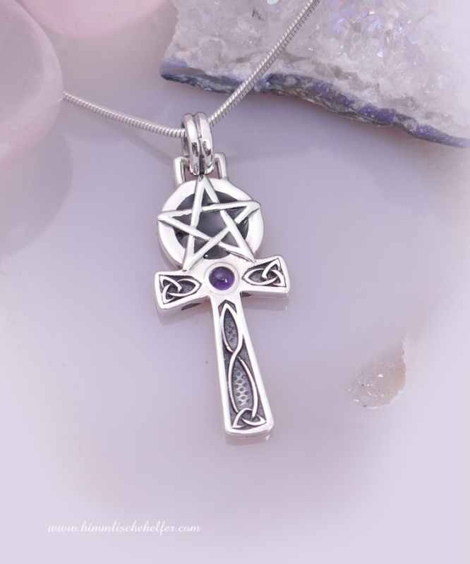 Wunderschöner Ankh Anhänger aus 925er Sterling Silber, verbunden mit einem Pentagramm und keltischen Knoten vereint dieser Kettenanhänger die Bedeutung von mehreren spirituellen Symbolen. Verziert mit einem Amethyst wird dieses Schmuckstück zu einem Schutzamulett. Das Ankh ist das ägyptische Lebenskreuz - es steht für Leben, Gesundheit und Unsterblichkeit. Das Pentramm gilt als mächtiges Schutzsymbol. Der Amethyst als Stein der Träume, Freundschaft und Spiritualität verbindet uns mit der Kraft der Steine. Kunstvoller Silberschmuck in filigraner Ausarbeitung, edles Schmuckdesign nach Künstlervorlage, handpoliert. Material: 925er Sterling Silber, Pentagramm mit schwarzer Schmuckfarbe hinterlegt, was einen schönen Kontrast zum Silber schafft, Amethyst in Silber gefasst (nicht geklebt). Lieferung ohne Kette (fotografiert mit einer Schlangenkette 1,2mm) ohne Dekoration. Größe Ankh Anhänger inkl. Aufhängung ca. 4cm x 1,5cm.