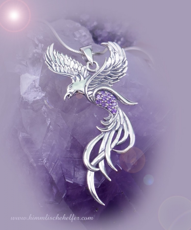 Ein wunderschöner Phönix im Flüg mit ausgebreiteten Flügeln als Symbol für Heilsein, Stärke und Erfolg. Der Phönix ist ein mächtiges Schutz Amulett und ein ganz besonderes Krafttier. Aus den Flammen wiedergeboren, ist er ein Zeichen für den Kreislauf des Lebens und des Lichts, da er mit der Sonne, die jeden Abend untergeht um am Morgen neu geboren zu werden, in Verbindung gebracht wird. Ein großer Phönix Anhänger, der verzaubert und die Blicke auf sich zieht in einer wunderschönen Silberarbeit zum Leben erweckt. Kunstvoller Silberschmuck in filigraner Ausarbeitung, edles Schmuckdesign nach Künsterlvorlage - feine Ausarbeitung mit viel Liebe zum Detail. Tierschmuck mit dem Zauber und der Magie der Tierwelt: Tiere sind unsere Begleiter, unsere Verbündeten, sie sind Totem und Wächter, sie überbringen Botschaften aus der geistigen Welt. Sie schenken uns Kraft, Zuversicht, Trost und Freude. Tiere als Schmuckstücke sind deshalb etwas ganz Besonderes: sie rufen unsere Verbindung zur Natur wieder ins Bewußtsein und wir können auf diese Weise unsere persönliche Beziehung zu den Tieren stärken... Phönix Anhänger aus 925er Sterling Silber mit Amethyst Steinen besetzt. Lieferung in einem hübschen Organza Täschchen, Lieferung ohne Kette (fotografiert mit einer Schlangenkette 1,2mm Durchmesser). Gesamtlänge des Phönix Anhängers inkl. Aufhängung: 5,2cm x 2,5cm.