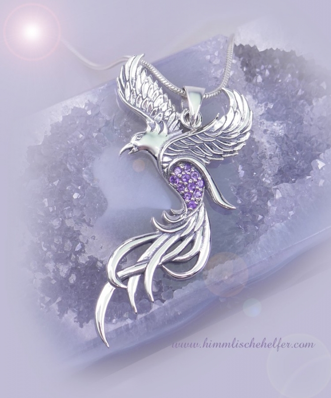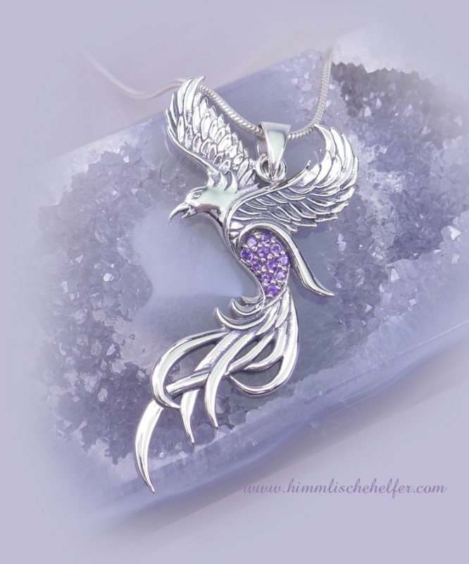 Phönix Anhänger aus 925er Sterling Silber, Amethyst, Gesamtlänge inkl. Aufhängung: 5,2cm x 2,5cm.