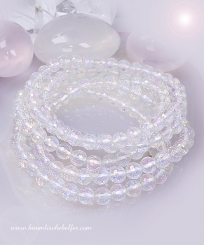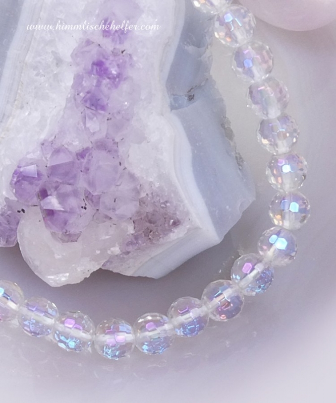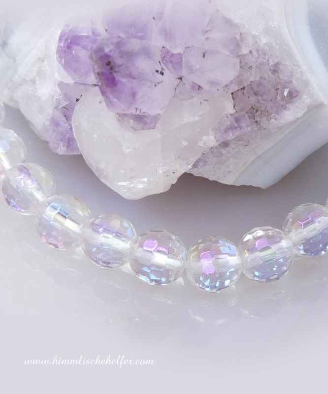 Ein Engelarmband mit wunderschönem schillernder Effekt in den Farben des Regenbogens - so durchscheinend schön mit irisierendem Effekt, dass es sich kaum im Bild festhalten lässt. Edelsteinarmband, Bergkristall, bedampft, Durchmesser der Perlen ca. 6mm, facettiert, Länge ca. 19cm, geliefert wird ein Armband, ohne Dekoration.