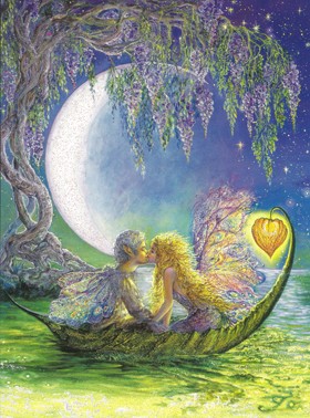 Ein verliebtes Elfenpaar treibt auf einem kleinen Boot unter einem Blauregen. Die blauen Blüten werden vom abnehmenden Mond beschienen. Ein Moment voller Liebe und Glück - ein Augenblickt voller Magie und Zauber!