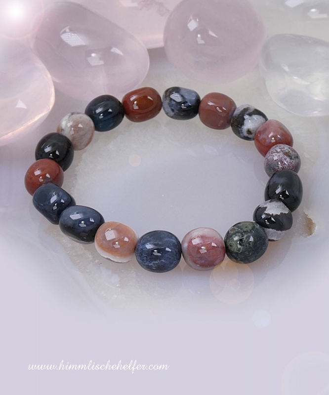 Der Buntjaspis wirkt besonders schön durch die vielen Farben, die sich harmonisch aneinanderreihen. Der Buntjaspis fördert die Kreativität. Er schenkt Harmonie und Schutz. Er symbolisiert Regeneration, Widerstandskraft, Stärkung bei Kraftlosigkeit und es heißt, dass er ein guter Begleiter bei Geburt und Schwangerschaft ist und dass er unsere Energiereserven aufbauen kann.