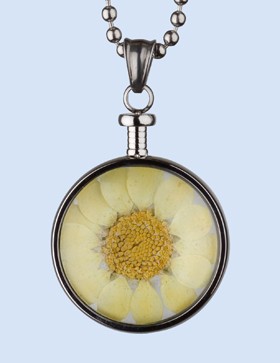 Wunderschöner Chrysanthmenanhänger von Blumenkind®. Echte Chrysantheme in Gelb - jede Blüte ist einzigartig und ein Unikat der Natur - Gefasst in Rhodium (Stahl). Durchmesser 3,5cm, Lieferung ohne Kette. Material: 316L Stahl, Anti-allergisch, sehr gute Hautverträglichkeit. Die Blüten sind eingegossen und von beiden Seiten gut zu sehen. Legierung durch Ionisierung, der Schmuck läuft nicht an.Original Blumenkind-Anhänger, erkennbar an der Lasergravur mit Peacezeichen auf der Unterseite des Anhängers.