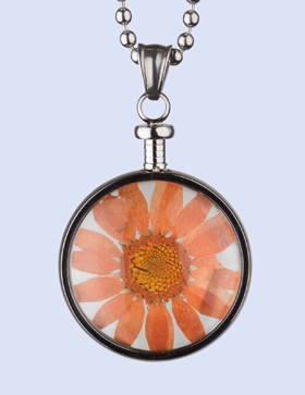 Wunderschöner Chrysanthmenanhänger von Blumenkind®. Echte Chrysantheme in Orange - jede Blüte ist einzigartig und ein Unikat der Natur - Gefasst in Rhodium (Stahl). Durchmesser 3,5cm, Lieferung ohne Kette. Material: 316L Stahl, Anti-allergisch, sehr gute Hautverträglichkeit. Die Blüten sind eingegossen und von beiden Seiten gut zu sehen. Legierung durch Ionisierung, der Schmuck läuft nicht an.Original Blumenkind-Anhänger, erkennbar an der Lasergravur mit Peacezeichen auf der Unterseite des Anhängers.