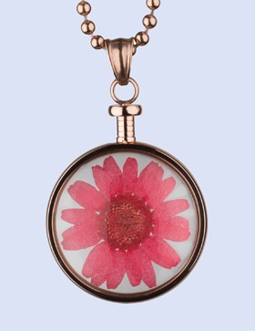 Wunderschöner Chrysanthmenanhänger von Blumenkind®. Echte Chrysantheme in Rot - jede Blüte ist einzigartig und ein Unikat der Natur - Gefasst in Rosegold. Durchmesser 3,5cm, Lieferung ohne Kette. Material: 316L Stahl, Anti-allergisch, sehr gute Hautverträglichkeit. Die Blüten sind eingegossen und von beiden Seiten gut zu sehen. Legierung durch Ionisierung, der Schmuck läuft nicht an.Original Blumenkind-Anhänger, erkennbar an der Lasergravur mit Peacezeichen auf der Unterseite des Anhängers.