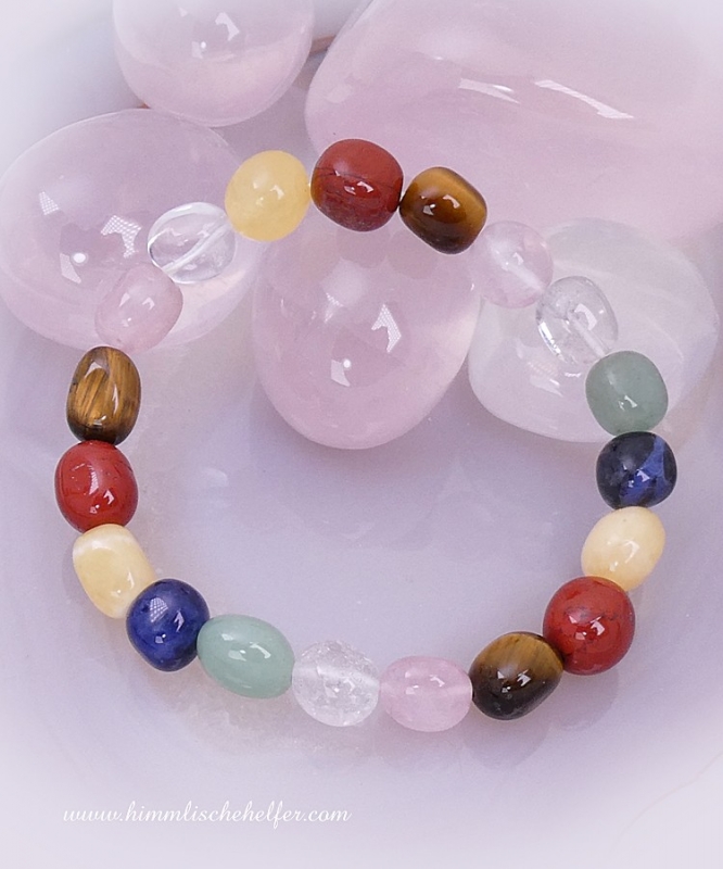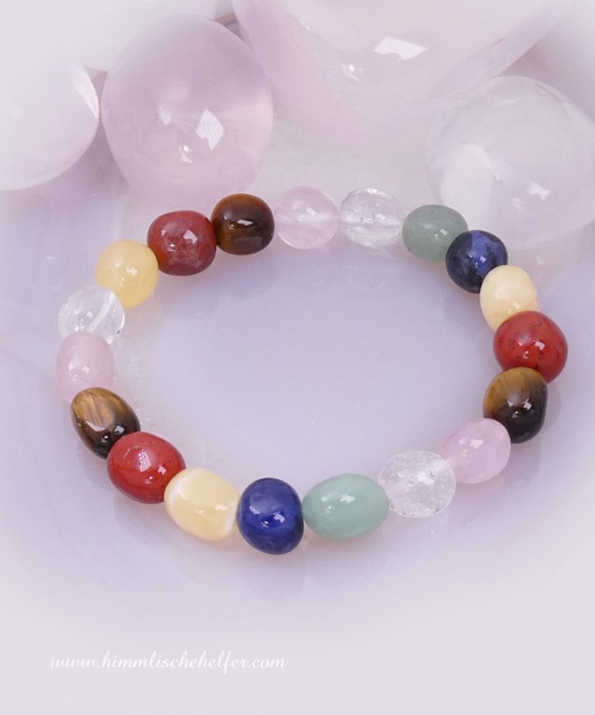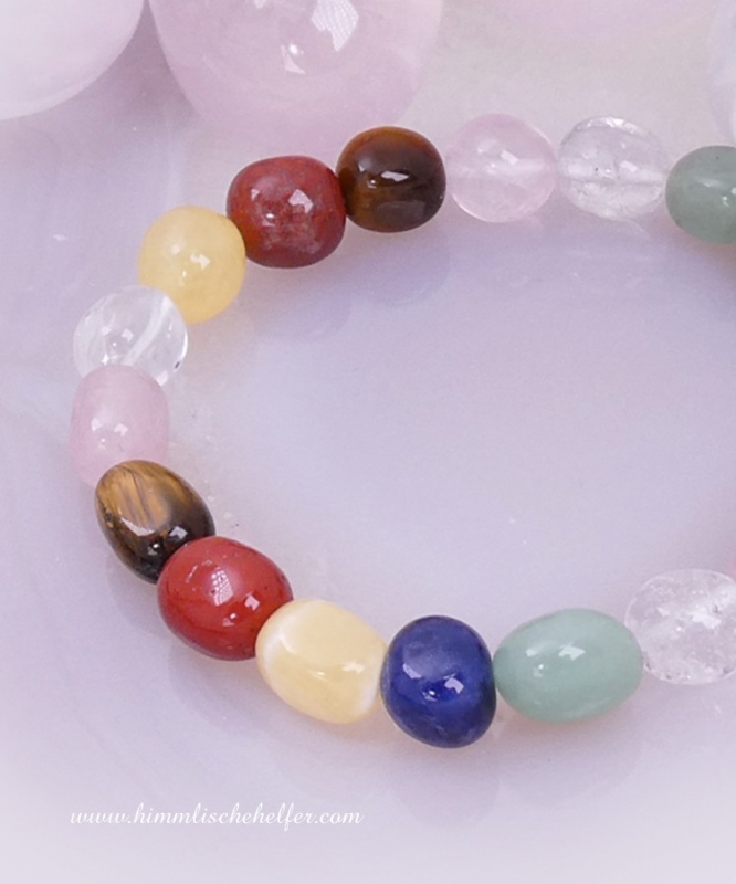 Edelsteinarmband aus einer schönen Zusammenstellung verschiedener Edelstein, Nugget Form auf elastischem Band. Für mehr Stärke, Klarheit, Erdung und inneres Gleichgewicht im Alltag, für Achtsamkeit und Selbstvertrauen. Ein Armband aus echten Edelsteinen (Carneol, Jaspis, Tigerauge, Orangencalcit, Bergkristall, Aventurin, Dumortierit). Der Carneol schenkt Lebensfreute und Tatkraft. Der Jaspis erdet und schenkt Selbstvertrauen. Tigerauge schützt vor negativer Energie und schenkt Mut. Orangencalcit ist ein Stein des Lichts, er stärkt die Kreativität und fördert Optimismus. Der Bergkristall ist der Stein der Klarheit, er stärkt die Kraft und Eigenschaften aller anderen Edelsteine. Der Aventurin schenkt Ruhe und innere Balance. Trägt sich sehr angenehm und durch die Größe der Nuggets fühlt man auch die Edelsteine besonders schön beim Tragen. Ein wunderschönes Edelsteinarmband mit der Kraft der Steine. Lieferung ohne Dekoration. Edelsteinperlen in natürliche Nuggetform, ca. 1cm, Länge Armband ca. 19cm.
