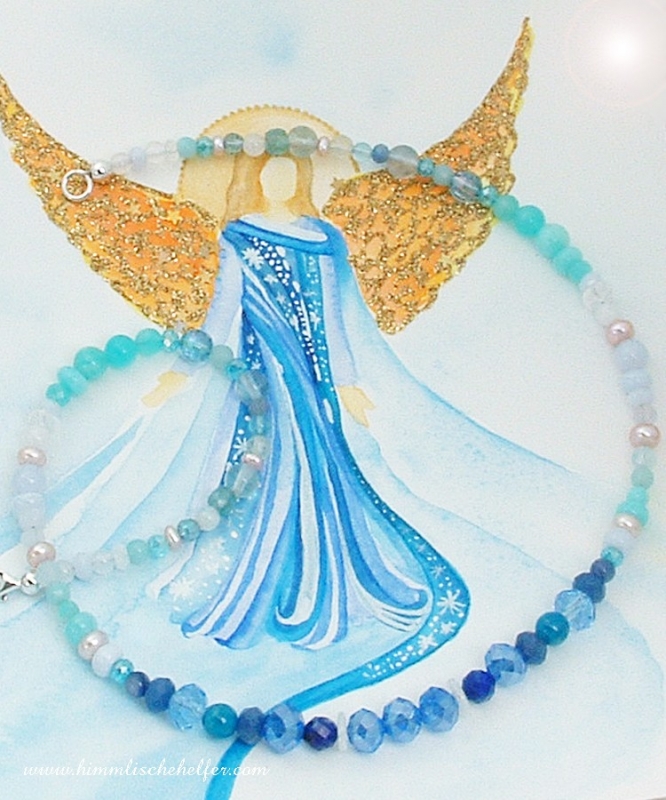Engelkette aus Edelsteinen und funkelnden Kristallglasperlen ganz in der Farbe und Energie des Engels der Möglichkeiten und neuen Wege. Sein blaues Licht spiegelt sich in dieser Engelkette und trägt seine Energie. Licht und Farbe, Kristallglanz und Edelsteine vereint, um Dich zu erinnern, dass der Engel der Möglichkeiten an Deiner Seite ist. Wenn sich etwas in Deinem Leben ändern soll, dann achte auf die Zeichen und vertraue. Der Engel der neuen Möglichkeiten unterstützt Dich und ist an Deiner Seite, wenn Du ihn um Hilfe bittest. 925er Silber auf hochwertiger Schmuckstahlseide gefädelt. In liebevoller Handarbeit in unserer eigenen Engelwerkstatt hergestellt, die Steine werden sorgfältig ausgesucht und liebevoll zusammengestell, ein wunderschönes Einzelstück. Blauquarz, Calchedon, Amazonit, echte Perlen, Fluorit, Regenbogenmondstein, 2 facettierte Lapislazuli Perlen, blaue funkelnde Lichtkristalle aus Kristallglas. Lieferung ohne Dekoration und Bild. Länge: ca. 43,5cm, eine kürzere Kette, die hoch am Hals getragen wird.
