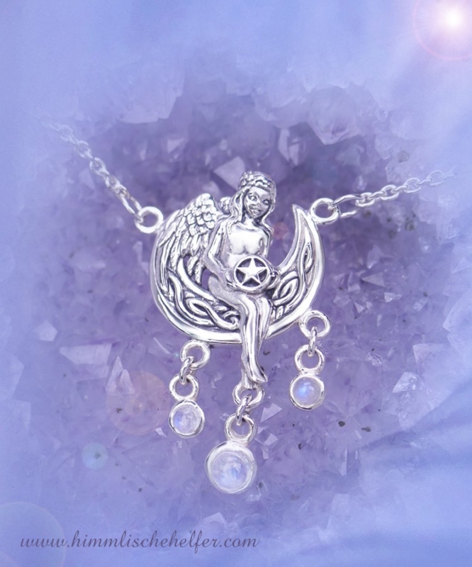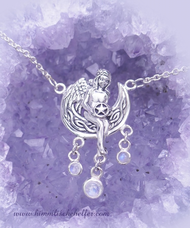Eine wunderschöne Engelkette, die die Kraft der Symbole vereint: Der Stern symbolisiert Wunscherfüllung. Er erinnert uns daran, das wir das scheinbar Unmögliche erreichen können und an die Verwirklichung unserer Träume. Der Engel symbolisiert den Schutz und die Hilfe der Engel. Der Regenbogenmondstein stärkt die Intuition und Hellsichtigkeit. Der Mond ist mystisch und geheimnisvoll. Er symbolisiert die Weiblichkeit und gilt als kraftvolles Amulett der Frauen. Die verschlungenen keltische Knoten, symbolisieren Schutz und Glück.