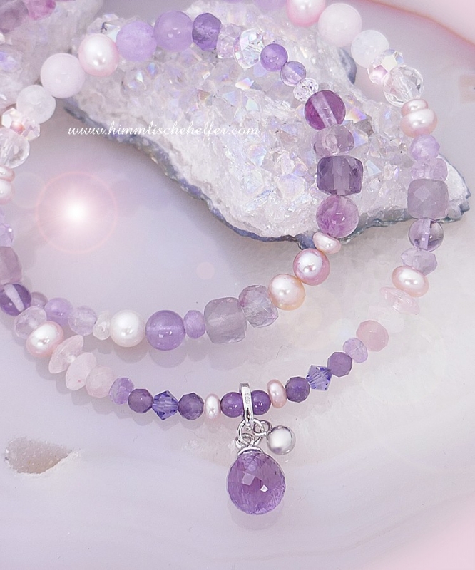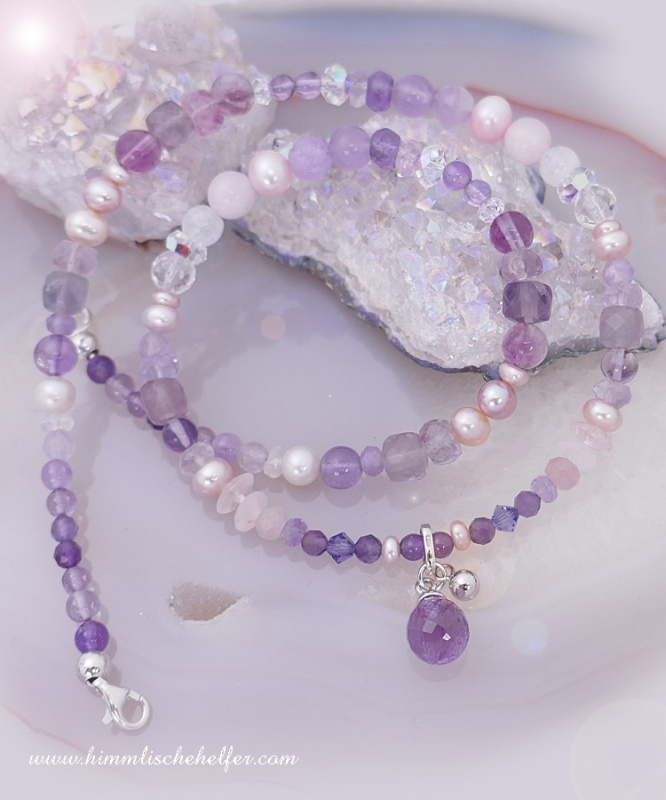 Wunderschöne Engelkette in der Energie und den Farben der Erzengel Metatron, Chamuel und Zadkiel - eine Kette die Liebe, Licht und die Erfüllung von Herzenswünschen symbolisiert. Wie reines funkelndes Licht der Engel, mit der Kraft der Edelsteine verbunden. Liebe Diese Engelkette ist ein ganz besonderes Schmuckstück, das stets an die Hilfe und Begleitung der Engel erinnert: Ein sanftes Farbspiel durchwebt von zartem Perlenglanz und funkelnden Kristallen. Die Farben und die Edelsteine symbolisieren die Erzengel - so werden wir stets an die Erzengel erinnert und daran, dass sie uns zur Seite stehen, wenn wir sie nur um Unterstützung bitten. Sie können uns in allen Bereichen unseres Lebens zur Seite stehen und berühren unser Innerstes. So helfen sie uns auch Klarheit zu bekommen, sie schenken Erkenntnis und können alte Muster und Blockaden lösen. Verschluss: 925er Silber auf hochwertiger Schmuckstahlseide gefädelt. Amethyst, Rosenquarz, Regenbogenmondstein, Fluorit, Kunzit, Bergkristall, Perlen, facettierte funkelnde Lichtkristalle aus facettiertem Kristallglas, sowie ein facettierter Amethyst Tropfen mit einer kleinen Silberkugel, die Vollkommenheit symbolisiert. In liebevoller Handarbeit in unserer eigenen Engelwerkstatt hergestellt, die Steine werden sorgfältig ausgesucht und farblich aufeinander abgestimmt. Länge der Engelkette: ca. 44cm.