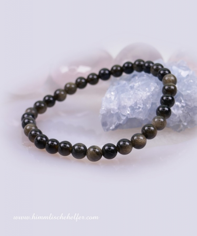 Goldobsidian Edelsteinarmband. Der Goldobsidian hält negative Energien ab, die von außen kommen, gleichzeitig schützt er aber auch davor, dass wir unsere eigene Energie ungewollt abgeben und uns so kraftlos fühlen. Er wirkt wie ein Schutzschild, das alles Störende fern hält, so dass wir in unserer Energie ruhen und in unserer Mitte bleiben. Entspannung, Sicherheit, Geborgenheit, eingehüllt in das samtige Schwarz des Goldobsidians.