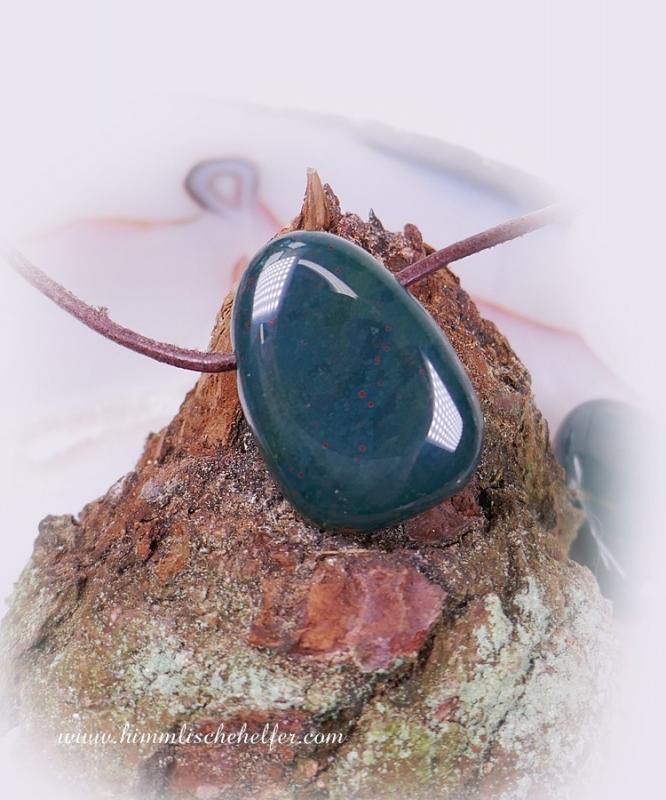 Sehr schöner Heliotrop Edelsteinanhänger, Trommelstein gebohrt, Lieferung ohne Lederband. Der Heliotrop steht ganz in der Farbe und der Energie von Erzengel Raphael, dem Engel der Heilung. Der Heliotrop ist ein erdender und vitalisierender Stein. Er schenkt Stärke und Ausdauer, hilft klare Entscheidungen zu treffen, ein Stein der Erneuerung. Trommelstein mit Bohrung - ein Schmuckstein, der sich gut an einem Lederband tragen lässt. Trommelsteine sind Unikate und deshalb sehr persönliche Schmucksteine. Ihr vorgeformtes ursprüngliches Aussehen wird durch mehrfache Schleifvorgänge poliert. Lieferung in einem hübschen Organza Täschchen, geliefert wird ein Heliotrop Anhänger. Ähnlich wie Abbildung: Mineralien sind Einzelstücke der Natur, jeder Stein ist einzigartig und variiert in der Form. Größe Heliotrop Edelsteinanhänger ca. 2,8cm x 2cm.