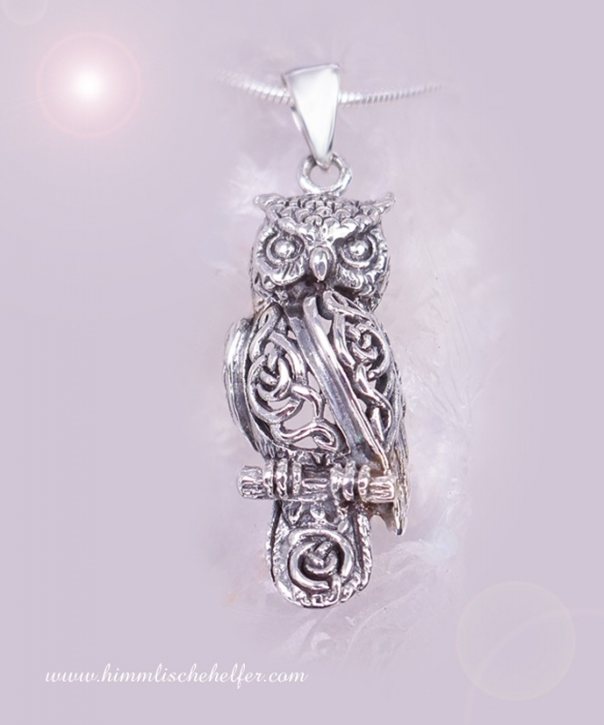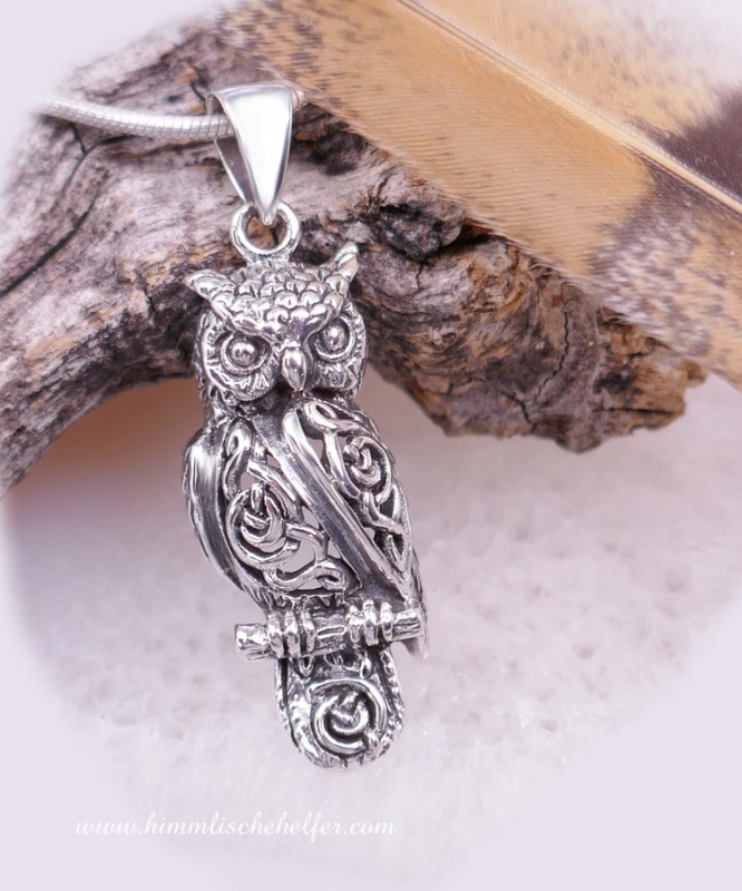 Eine wunderschöne Eule die mit keltischen Schutz- und Glücksknoten verziert ist - die Eule als Krafttier und Begleiter Krafttier mit einer ganz besonderen Bedeutung. Kunstvoller Eulenschmuck in filigraner Ausarbeitung, edles Schmuckdesign und feine Ausarbeitung mit viel Liebe zum Detail, handpoliert. Eulenanhänger mit dem Zauber und der Magie der Tierwelt: Tiere sind unsere Begleiter, unsere Verbündeten, sie sind Totem und Wächter, sie überbringen Botschaften aus der geistigen Welt. Sie schenken uns Kraft, Zuversicht, Trost und Freude. Tiere als Schmuckstücke sind deshalb etwas ganz Besonderes: sie rufen unsere Verbindung zur Natur wieder ins Bewußtsein und wir können auf diese Weise unsere persönliche Beziehung zu den Tieren stärken... Eulenschmuck aus 925er Sterling Silber. Lieferung ohne Kette (fotografiert mit einer Schlangenkette 1,2mm Durchmesser) in einem hübschen Organza Täschchen. Gesamtlänge des Eulenanhängers inkl. Aufhängung: 3,7cm x 1,1cm.