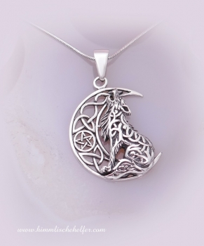 Der Wolf symbolisiert Führung, Schutz, Kraft und innere Stärke und er weiht in altes Wissen ein. Dieses wunderschöne keltische Wolf Amulett wird noch durch die Symbolik des Mondes verstärkt, die kelitschen Knoten symbolisieren Glück, Schutz und Segen.