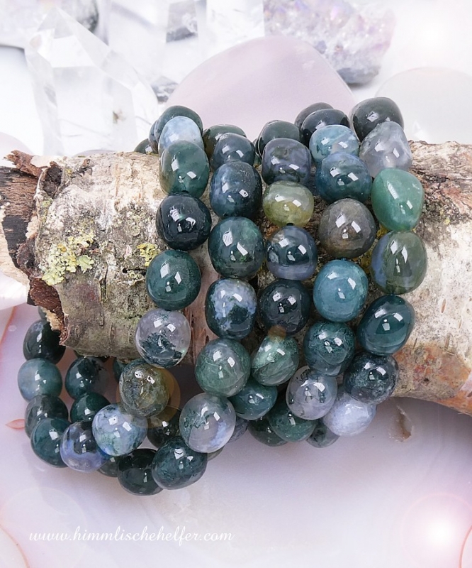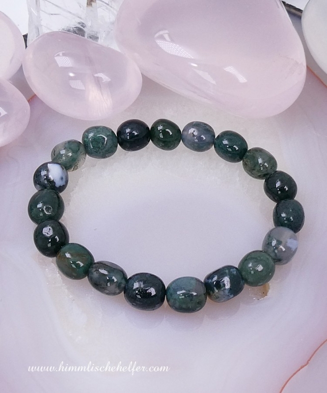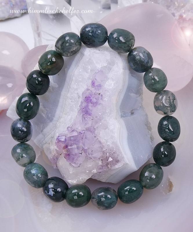 Ein Moosachat Edelsteinarmband ist der richtige Begleiter für alle, die Ziele und Pläne haben - er wird seit den alten Zeiten als Glücksstein und Herzensstein geschätzt. Es heißt, er hilft Täuschungen zu erkennen und Situationen richtig einzuschätzen.