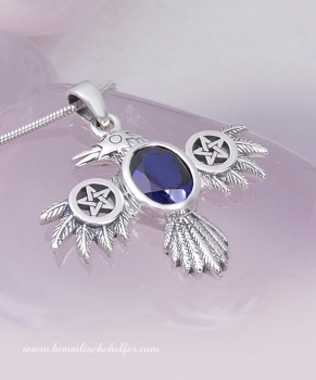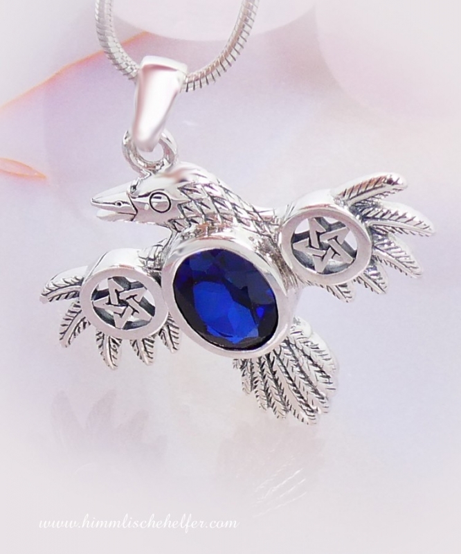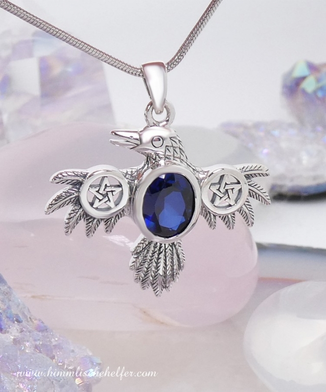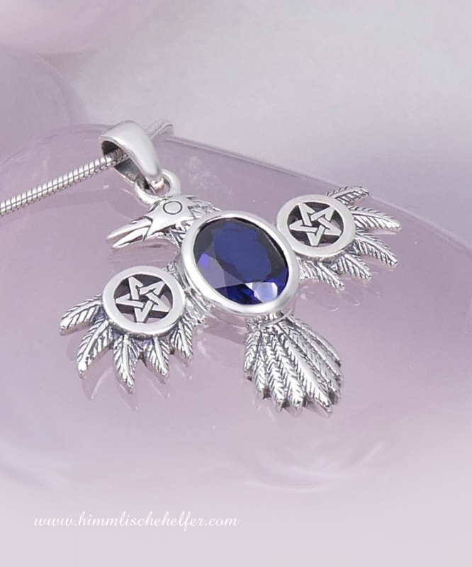Ein wunderschöner Rabe mit Pentagramm in den Flügeln. Sein Körper ist mit einem klaren durchscheinenden intensiven synthetischen Saphir verziert. Ein Amulett für starken Schutz mit der Kraft des Raben für Mut, Weisheit, Intelligenz und Prophezeiungen. Der Rabe symbolisiert Weisheit und Intelligenz. Er ist ein Bote zwischen den Welten, der Prophezeiungen allein mit seiner Gegenwart unterstützt.