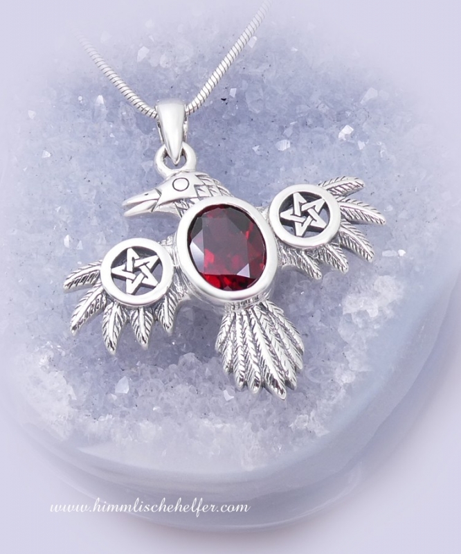 Ein wunderschöner Rabe mit Pentagramm in den Flügeln. Sein Körper ist mit einem klaren tiefroten Granat verziert. Ein Amulett für starken Schutz mit der Kraft des Raben für Mut, Weisheit, Intelligenz und Prophezeiungen. Der Rabe symbolisiert Weisheit und Intelligenz. Er ist ein Bote zwischen den Welten, der Prophezeiungen allein mit seiner Gegenwart unterstützt.