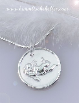 Ein wunderschöner kleiner Schutzengel Anhänger in Medaillenform Engelschmuck aus 925er Silber, rhodiniert. Lieferung ohne Kette (fotografiert mit einer Schlangenkette 1,2mm) in einem schönen Organza Täschchen - ein schöner Schutzengel Anhänger für jede Gelegenheit. Länge mit Aufhängung 1,8cm x 1,5cm