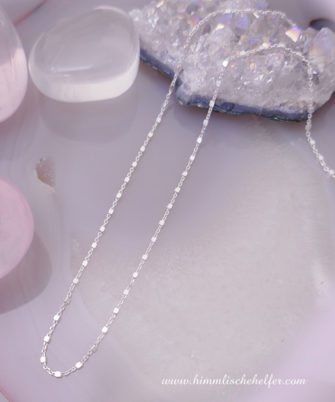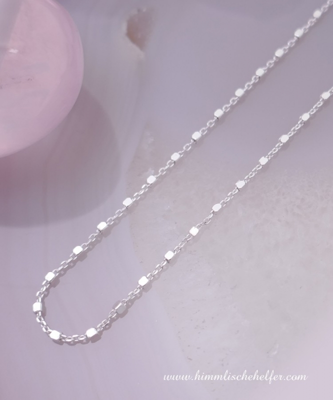 Eine ganz besondere Kette, die ein Schmuckstück an sich darstellt: Silbrig funkelnd im Licht, bewegliche Kettenglieder mit feinen Würfeln versehen - zart und glitzernd wirkt sie ganz besonders lebendig.