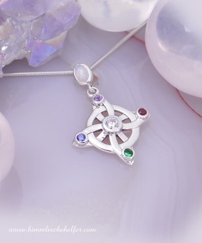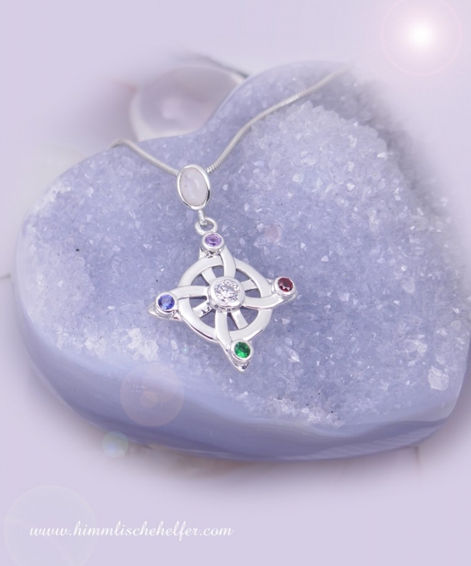 Vierfachknoten "Quaternary" - ein wunderschöner traditioneller keltischer Schutzknoten, ganz im Zeichen der Zahl Vier. Schutz und Glück, verbunden mit einem Ewigkeitskreis und der Bedeutung der Zahl 4. Ein keltischer Knoten für Schutz und Glück, ohne Anfang und Ende verschlungen. Ein Endlosknoten der Ewigkeit, der zeigt, dass alles verbunden ist. Der uns mit der spirituellen Ebene verbindet und uns für das Feinstoffliche empfänglich mach. Er verbindet uns mit der alten Zeit, mit der Anderswelt und dabei legt er seinen Schutz um uns. Im Hier und Jetzt führt er uns über die Grenzen des Sichtbaren hinaus, er zeigt uns die Ewigkeit, das Göttliche, das Eine, aus dem alles entspringt und zu dem alles zurückkehrt. Verstärkt wird die Bedeutung durch die verschiedenen Steine: ein klarer leuchtender Stein für Licht in der Mitte, ein roter Stein für die Liebe, ein grüner Stein für Lebensenergie und Heilsein, ein lilafarbener Stein für spirituelle Erleuchtung und ein blauer Stein für Schutz. Kunstvoller Silberschmuck in hochwertiger Ausarbeitung, edles Schmuckdesign nach Künstlervorlage gearbeitet, handpoliert. Keltischer Silberschmuck aus 925er Sterling Silber, mit klaren funkelnden exakt geschliffenen Zirkonia Steinen. Die Aufhängung ist mit einem Regenbogenmondstein verziert. Lieferung in einem hübschen Organza Täschchen, ohne Kette (Abbildung mit einer dünnen Schlangenkette 1,2mm Durchmesser) Größe keltischer Schutzknoten inkl. Aufhängung ca. 3,4cm x 2,4cm.