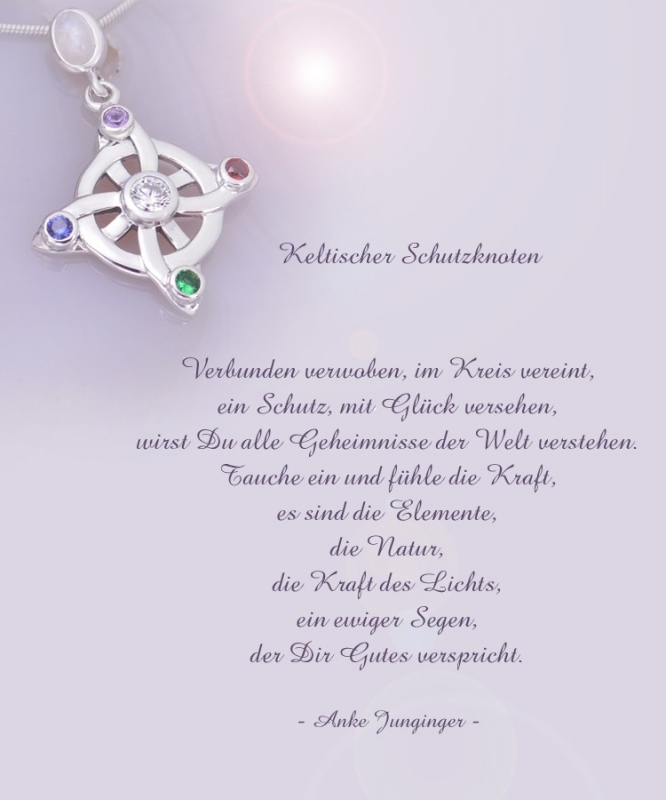 Ein wunderschöner keltischer Knoten ohne Anfang und Ende. Mit einem Kreis verwoben stellt er ein sehr altes und mächtiges Schutz- und Glückssymbol dar. Dieser keltische Knoten symbolisiert die Kraft der Zahl Vier - er symbolisiert die Einheit und die Ewigkeit, da er keinen Anfang und kein Ende hat. Er verbindet und schafft aus der Vier eine Einheit, gleichzeitig verbindet uns mit der Kraft der Natur und der Elemente.