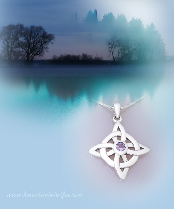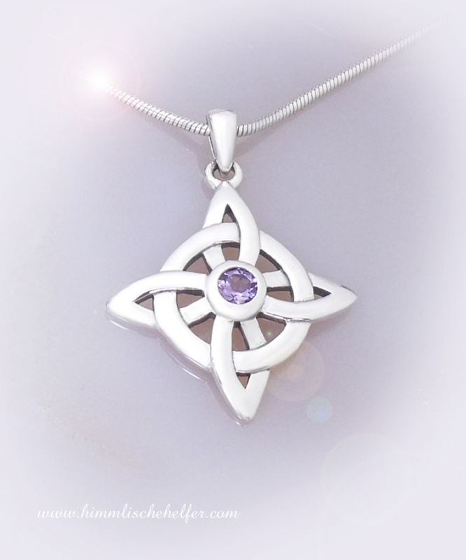 Keltischer Vierfachknoten, ein Symbol für Schutz, Glück und Unendlichkeit, verziert mit einem funkelnden Amethyst. Ein keltischer Knoten für Schutz und Glück, ohne Anfang und Ende verschlungen. Ein Endlosknoten der Ewigkeit, der zeigt, dass alles miteinander verbunden ist. Der uns mit der spirituellen Ebene verbindet und uns für das Feinstoffliche empfänglich macht. Er verbindet uns mit der alten Zeit, mit der Anderswelt. Der Amethyst gilt als Stein der Träume, Freundschaft und Spiritualität, er verbindet uns mit der Kraft der Natur und der Bedeutung der Edelsteine. Spiritueller Schmuck in hochwertiger Ausarbeitung, edles Schmuckdesign nach Künstlervorlage gearbeitet, handpoliert. Keltischer Knoten, spiritueller Schmuck, aus 925er Sterling Silber, mit einem gefassten facettierten Amethyst, Durchmesser ca. 3,7mm. Lieferung in einem hübschen Organza Täschchen, ohne Kette (Abbildung mit einer dünnen Schlangenkette 1,2mm Durchmesser) Größe keltischer Schutzknoten inkl. Aufhängung ca. 3,3 x 2,5cm.